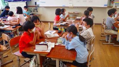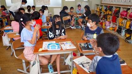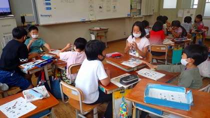 グループの友達同士で,“What subjects do you like?”と尋ね,“I like 〜.”と答える活動をしています。答えたカードのやり取りをして,同じ教科のカードが2枚そろったら手放す「ババ抜き」ゲームをしながらの活動なので,大変盛り上がっていました。