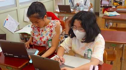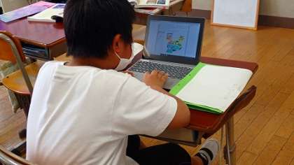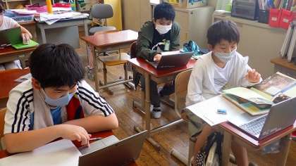 身の回りにある環境やごみに関する様々な問題についてテーマを決め,それぞれの問題についての資料を集める活動をしています。GIGA端末を活用して調べ学習をしたり,アンケートをつくったりしています。