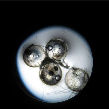 肉眼でも透き通ってたまごの中が見えますが,顕微鏡を通して観察すると,目ができたこと,血管を血液が流れていること,たまごの中でメダカが動くこと等,変化がよく分かります。