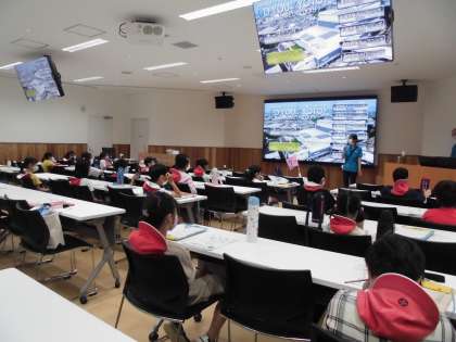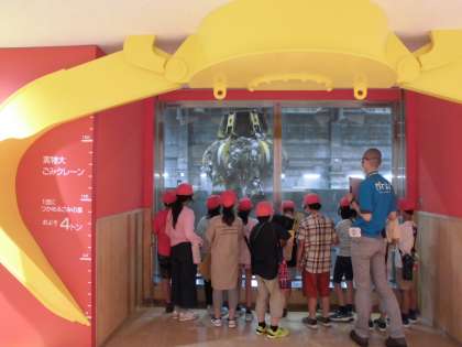 実際に,クレーンでごみを細かくつぶすところを見せてもらいました。子どもたちは,大きなクレーンでごみを運ぶので,びっくり。また,ごみを燃やした熱を利用して,電力をつくり「さすてな京都」の電気をまかなっていることを聞いて,驚く場面もありました。