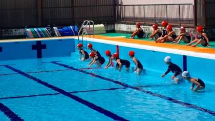 プールサイドでは,学習についての説明や約束などのお話を聞きました。その後,先生の「1」から「4」の指示に合わせて,プールに入りました。