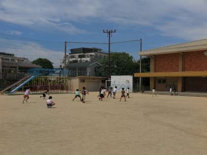 2時間目まで降っていた雨が,中間休みにはすっかりやみ,夏らしい青空が広がってきました。その中で,2年生の子ども達が運動場いっぱいに広がって「だるまさんがころんだ」の遊びを楽しんでいました。