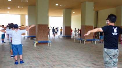 ラジオ体操8日目です。今日は,あいにくの雨模様でしたが,子どもたちはいつも通り朝から集まりました。運動場が使えなかったため,今日は「オクトパス(ピロティ)」で体操をしました。