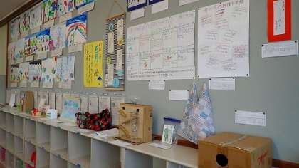 作品をつくるときにがんばったところや工夫したところなどをみんなに紹介しています。教室の後ろのロッカーや掲示板には,みんなの力作が並んでいました。