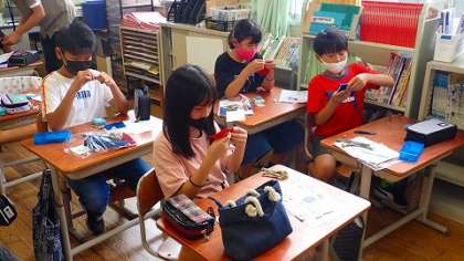 これまでに学習した縫い方やボタン付けの仕方を生かして,小物づくりをしています。みんな真剣な表情で縫い進めています。