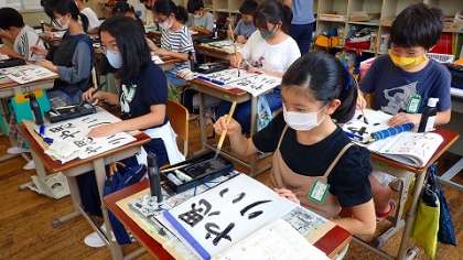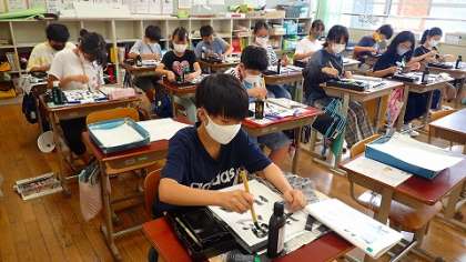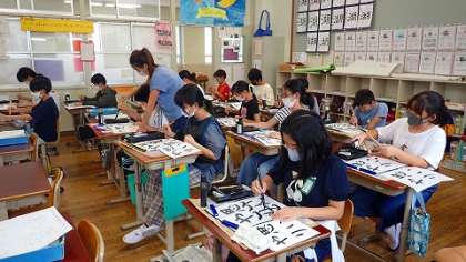 文字の大きさと配列,点画のつながりに気をつけて練習書きをしています。担任の先生からの「ここはまるいイメージで」や「撥ねた先からつながるように」などのアドバイスを受けて,ていねいに筆を動かしていました。