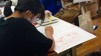 お話から絵に表したい場面を決め,イメージを広げながら下絵を描いています。色鉛筆を使って軽く色を乗せ,画面の様子を確かめています。どんな作品になるか楽しみです。