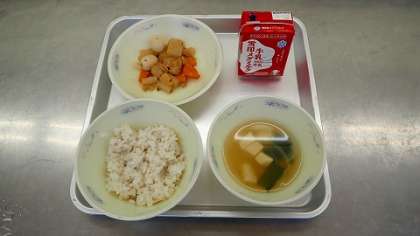 「プリプリ中華炒め」は子どもたちの大好きな献立です。鶏肉やうずら卵,しいたけ,こんにゃくなど,プリプリした食感の食材がたくさん使われています。にんにくの香りとピリっと辛いトウバンジャン,最後に加える酢がおいしさの秘密です。プリプリした食感を楽しみながらいただきました。