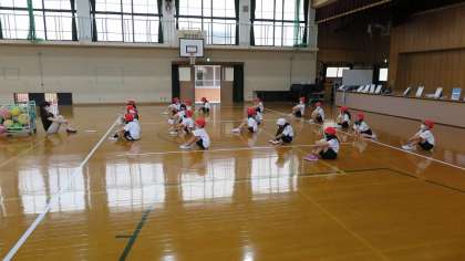体育の学習が始まる前には,他のお友達がそろうまでしっかりと三角座りをして待つことができています。