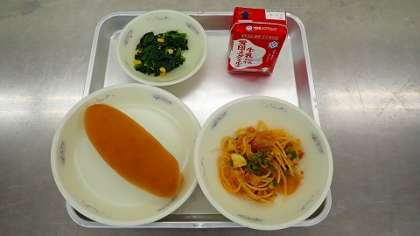 「イタリアンスパゲティ」には,ズッキーニが入っています。ズッキーニはかぼちゃの仲間で,水分が多く,体温を下げる働きがあります。いためたり煮込んだりすると甘みが増します。ズッキーニの食感を楽しみながら,ほどよいトマト味のイタリアンスパゲティをいただきました。