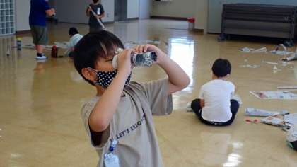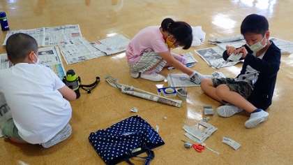 新聞紙を並べたり,破ったり,まとったり,丸めたり,ねじったりしながら手や体全体の感覚を働かせ,思い思いの作品づくりに取り組みました。