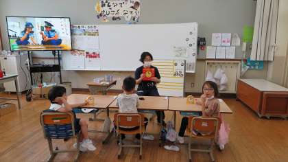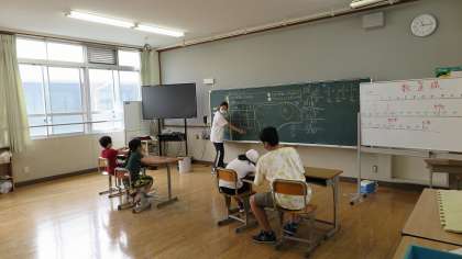 3・5・6年は,ダーツゲームを利用して計算の学習をしています。それぞれの学年に合わせてかけ算やたし算に取り組んでいました。もう一つの1・3年は,時計の勉強をしています。何時何分の読み方を練習していました。