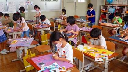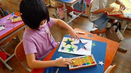 星の形の型紙を使って,画用紙に星を描きました。クレパスをティッシュペーパーで伸ばして描くことで,ぼんやりとした雰囲気の星がたくさん生まれました。このあと,どんな作品につながっていくのか楽しみです。