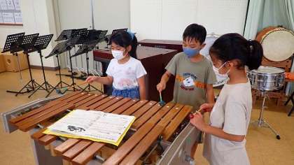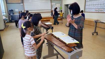 拍に乗って木琴を演奏しています。一緒に演奏する友達と息を合わせるために,声をかけ合って演奏していました。