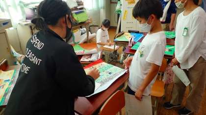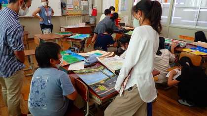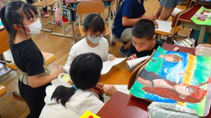 これまで取り組んできた「お話の絵」の作品が完成しました。今日は,完成した作品を友達同士で鑑賞し合いました。同じお話をもとにしても絵に表した場面はそれぞれ違います。どんな思いをこめて描いたのかを想像しながら,作品をの良さを見つけていました。
