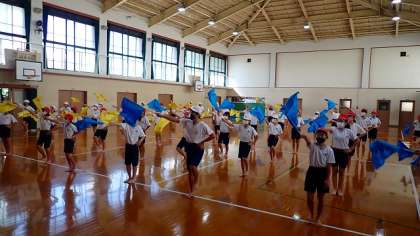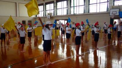 今日は,乾隆スポーツフェスティバルに向けて,「フラッグ」の演技の練習に取り組みました。青と黄色の2色のフラッグを使って演技をします。みな真剣な表情で,曲やカウントに合わせて旗を回す練習をしています。