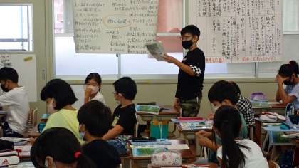川の上流と下流の流れや川原の石を比較し,流れる水の速さと川原の石の大きさの関係を調べました。ふり返りの時間では,今日の学習で学んだことを書き,発表していました。