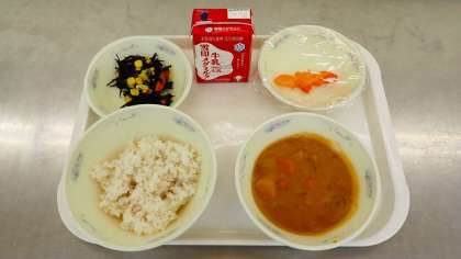 今日は,子どもたちの大好きなカレーです。牛肉,じゃがいも,にんじんなど,具だくさんのカレーです。ピリっと辛いカレーですが,ごはんと一緒に食べるとちょうどよい辛さです。今日で最後になる「こうもり」のハッピーキャロットもついていました。