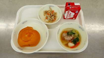 「肉だんごのスープ煮」には,しょうがの効いた肉だんごが入っています。700個以上の肉だんごを,給食調理員さんがひとつひとつ手作りでつくってくださいました。「ごぼうのソテー」はごまの風味たっぷりです。まぐろフレークとのバランスもよく,おいしくいただきました。