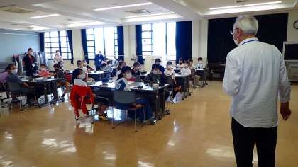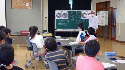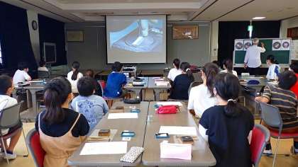 まずはじめに,「象嵌」とはどういうものか,象嵌の歴史などのお話をしていただき,映像で象嵌がつくられる工程を教えていただきました。みな大変興味深く話を聞き,映像で完成した象嵌を見せていただいたときには,匠の技に拍手が上がりました。