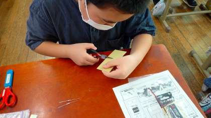 赤・青・緑の3つのLEDと抵抗器を組み合わせて,簡単な回路をつくります。先生の説明を聞きながら,みんな一生懸命製作に取り組みました。ラジオペンチなど,あまり使い慣れない道具に苦戦しながらの作業になりましたが,完成させようとみんな真剣な表情です。
