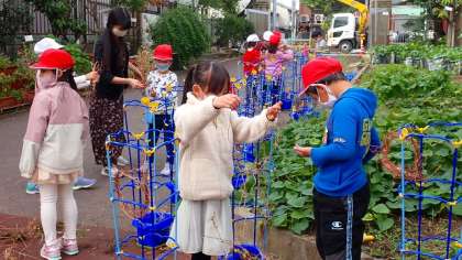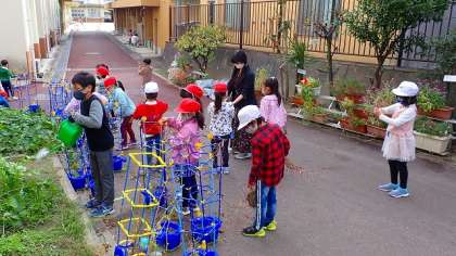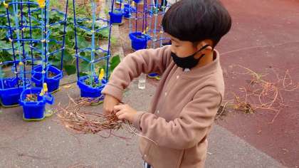 今日は,一人一鉢で育てたあさがおを植木鉢から抜いています。枯れてしまったあさがおのツルですが,捨ててしまうのではありません。ていねいに巻いて,わっか状にしました。この「わっか」に飾りをつけると…。何になるかお楽しみですね。