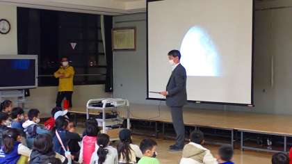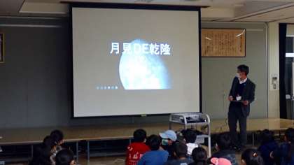 子どもたちが夜の学校に集まってきました。はじめに,育友会会長のご挨拶の後,校長先生が,月についてのお話をしてくださいました。花背山の家で撮影した,素敵な月の写真も見せてくださいました。