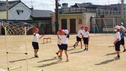 1時間の学習の流れやルールに慣れながら,ゲームを楽しんでいます。まだまだ上手にパスをしたり,パスをもらいやすい場所に移動したりするのは難しい様子ですが,これからの学習の中で身に付けていってほしいと思います。