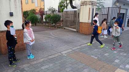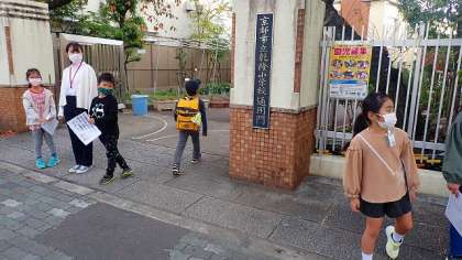 今日は,少し暖かさを感じる朝でした。2つのたてわりグループの子どもたちが正門と西門に分かれて,あいさつをしてくれました。