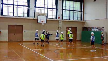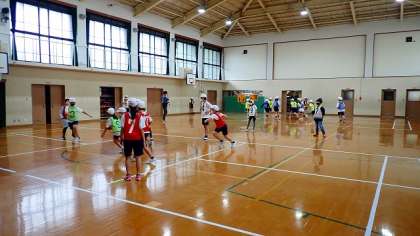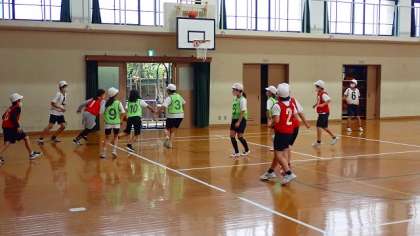 前の時間は,ドリブルやパスなど基本の練習をしました。今日は,いよいよゲーム形式の学習です。実際にゲームを進めながら,ルールを確かめたり,みんなが楽しく学習するためにどんな工夫をすればよいかを考えたりしています。