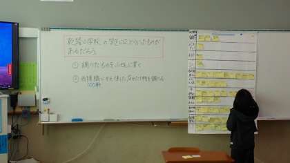 3年生は,総合的な学習の時間で乾隆学区の様子を調べています。乾隆学区には,お店や銀行,お寺などいろいろな建物があります。どんな建物が多いのか,見つけたものを付箋に書いて整理しました。