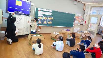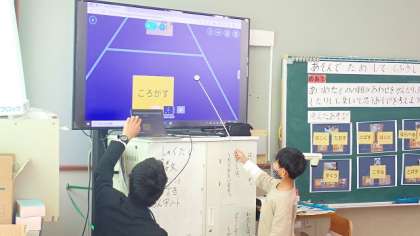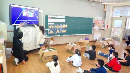 そして,テレビに映した画面を使って,自分たちの遊びを友達に伝えました。昨日までの遊びと変わったところを伝える子もいました。