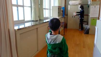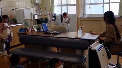 1年生が視力検査をしています。離れた場所からランドルト環を見て,「右」「下」と答えています。しっかり見えているでしょうか?目は,一生使うものです。普段から目を大切にしてほしいと思います。