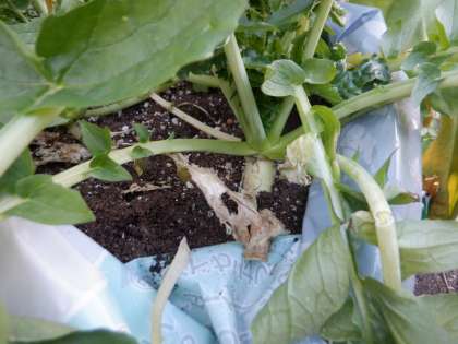 大根の様子です。植えてから約2ヵ月が経ちました。土の部分が見えなくなるほど,葉が大きくなっています。葉をかき分け,根元の方を見てみると…
