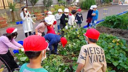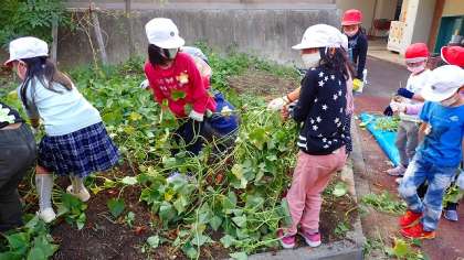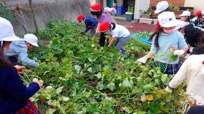 今日は,学校園で育ててきたサツマイモの収穫をしました。まず,みんなで協力してサツマイモのつるを抜きます。交代で畑に入り,たくさん伸びたつるを抜きました。ブルーシートの上は,つるで山盛りになりました。