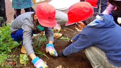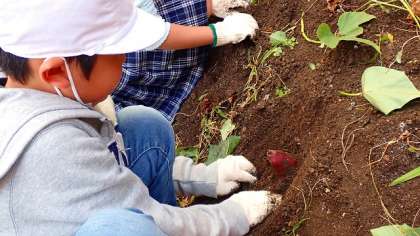 つるが全部抜けたら,いよいよサツマイモを掘り出します。サツマイモの表面を傷つけないで掘ることが大切だと,担任の先生から教わりました。