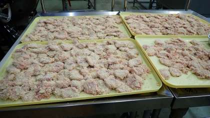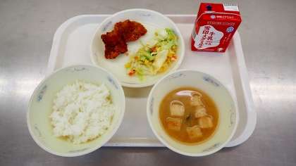 今日は,「給食感謝の献立」でした。子どもたちも大好きな「ヒレカツ」です。乾隆小学校ではおよそ10kgになる豚ヒレ肉一つ一つに下味をつけ,水で溶いた小麦粉とパン粉の衣をつけます。そして,それをていねいに油で揚げます。豚ヒレ肉のおいしさがギュッと詰まったヒレカツを,感謝の気持ちをこめていただきました。