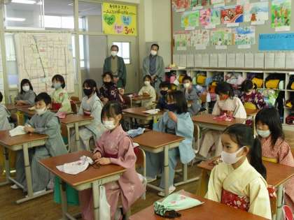 まずは,担任の先生の普段とは違う姿を見てみんなびっくり!!そのあと,4階の多目的ホールで,着付け師の先生から一人一人に用意された着物をせ着せていただきました。なかなか見ることのない着物に,子どもたちも興味津々です。