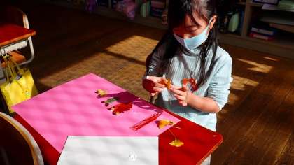 船岡山公園で拾ってきたたくさんのどんぐりや松ぼっくり,落ち葉など秋の素材を使って,おまつりの準備をしています。「どんぐりマラカス」をつくったり,秋の素材を貼り付けて絵を描いたりしています。