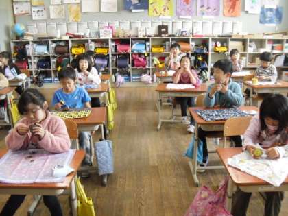 午前中に準備して出来上がった焼き芋を午後のおやつにいただきました。とてもきれいに焼き上がり,やわらかくて甘いほくほくのお芋になりました。たくさんの人のおかげで大きいお芋に育ち,おいしいお芋が食べられると感謝の気持ちをもって,いただきました。