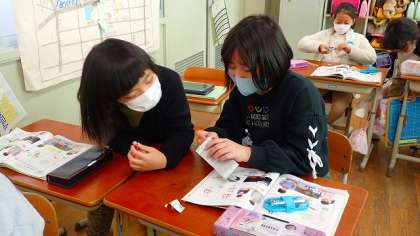 豆電球をに明かりをつける回路の中に,工作用紙とアルミホイルで作った「スイッチ」を入れます。まず,スイッチのしくみについて考えました。次に,スイッチを回路のどの部分につなぐかについて話し合い,実際に回路をつくって実験しました。豆電球に明かりがつくと,「ついた!」と歓声が上がっていました。