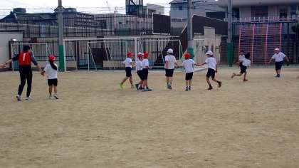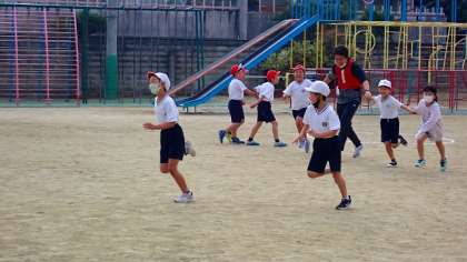 2年生が,息を切らせながら運動場を走り回っています。「てつなぎおに」をしているようです。手を繋いで迫ってくるおにをかわし,逃げ回っています。上手く逃げ切れたでしょうか?