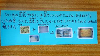 「グラタン」は,フランスで生まれた料理で,オーブンなどを使って表面に焼き目をつけます。今日の「ペンネの豆乳グラタン」は,豆乳で作ったルーとベーコン,野菜,ペンネを使ってスチームコンベクションオーブンで作りました。きれいな焼き目のついた,とてもおいしいグラタンになりました。