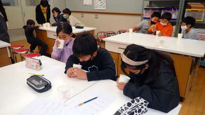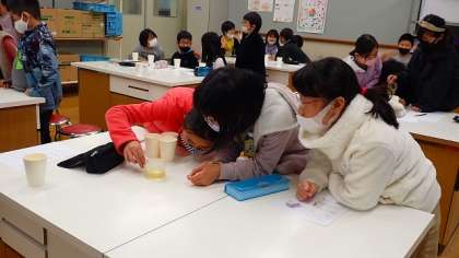 まず,見た目の様子はどうか,においはどうかを確かめてメモします。昆布だしとの違いに,子どもたちは驚いている様子でした。