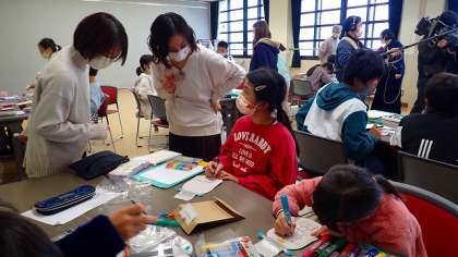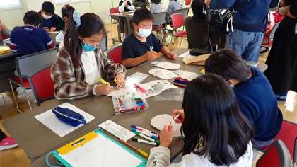 休憩をはさんで,ストーマ装具の「パウチ」に絵やメッセージをかく「デコパウチ」づくりに取り組みました。オストメイトの方への思いをこめて,ていねいに作業をしていました。