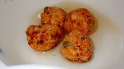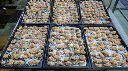 たくさん並んでいるのは,「がんもどきのあんかけ」の「がんもどき」です。全校の児童と教職員の分で,600個ほどのがんもどきをひとつひとつ手作りでつくってくださいました。とても良い色で,ふっくら仕上がりました。