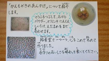 給食の「がんもどき」は,水気を切ったとうふに,とりひき肉・おから・にんじん・しいたけ・えだ豆を混ぜ合わせて作ってあります。だしの効いた「あん」をかけると,がんもどきのおいしさが引き立ち,ごはんによく合いました。