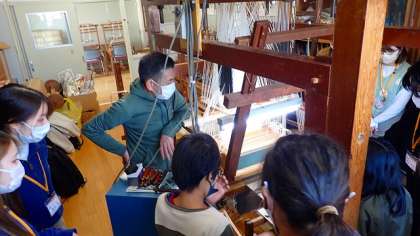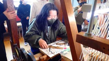 「失敗したらどうしよう」「まちがえずにできるかな」など,不安いっぱいだったと思いますが,大学生のみなさんにサポートしてもらいながら,ゆっくりと,ていねいに織り始めました。