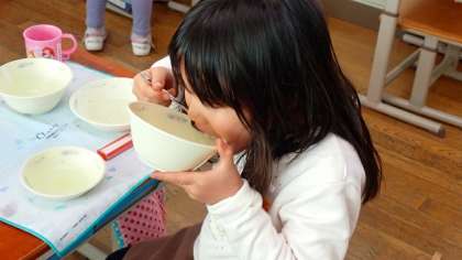 1年生の教室です。1年生にとっては,はじめての「フルーツ寒天」です。時間が経つと固まる不思議な「フルーツ寒天」に興味津々です。プルプルした寒天とフルーツの甘さを味わっていただきました。