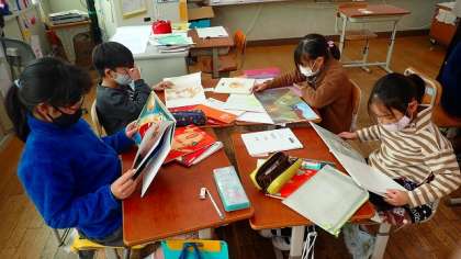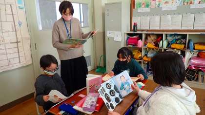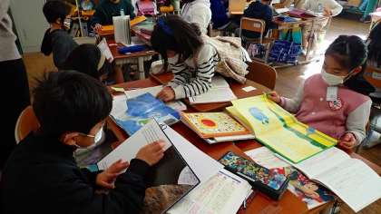 「1年生に読み聞かせをする」という目的でそれぞれが選んだ本を,班のメンバーで読み合っています。これからの学習では,本を1冊に決めるためにグループで話し合いをしていく予定です。
